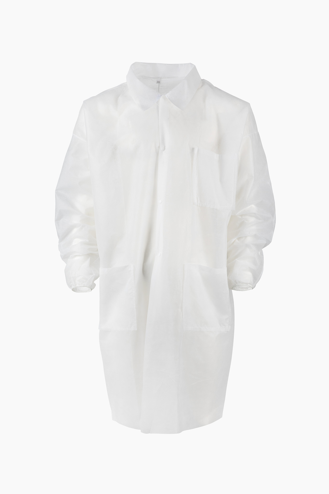 The 35 Gram multilayer nonwoven material lab coat is both breathable and comfortable. This coat is designed to fall just below the knee, and features an elastic wrist, snap front, and three pockets for convenience.